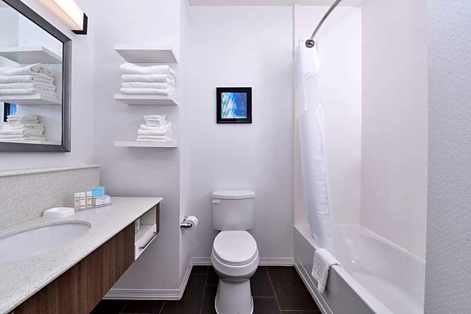 This mobility and hearing accessible, non-smoking room features one king-sized bed featuring our clean and fresh Hampton bed. The bath is equipped with accessible bath tub. The room also has a visual alarm and notification devices for the doorbell or door knock and incoming phone calls. The room features comfortable soft seating, microwave, refrigerator, a HDTV, and easy to operate alarm clock/radio. The free WiFi will help you stay connected while on the road. If you prefer not to work at the desk, you can use the convenient lapdesk instead. You'll also enjoy the convenience of having a coffeemaker with tea service and iron/ironing board in your room. Any corresponding photo may not reflect the specific accessible room type or room feature.