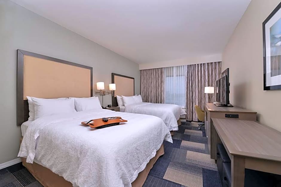 This mobility accessible, non-smoking room features two queen-sized beds featuring our clean and fresh Hampton bed. The bath is equipped with accessible bath tub. The room features comfortable soft seating, microwave, refrigerator, a HDTV, and easy to operate alarm clock/radio. The free WiFi will help you stay connected while on the road. If you prefer not to work at the desk, you can use the convenient lapdesk instead. You'll also enjoy the convenience of having a coffeemaker with tea service and iron/ironing board in your room. Any corresponding photo may not reflect the specific accessible room type or room feature.